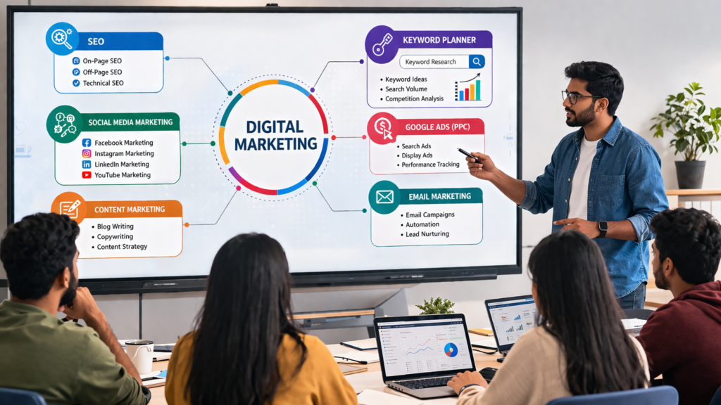 Digital marketing is suitable for anyone interested in building an online career. Students can learn digital marketing to improve job opportunities. Working professionals can upgrade their skills for better salary growth. Entrepreneurs can use digital marketing to promote their businesses. Freelancers can offer digital marketing services to clients worldwide. Even beginners with no technical background can easily learn digital marketing with proper guidance.